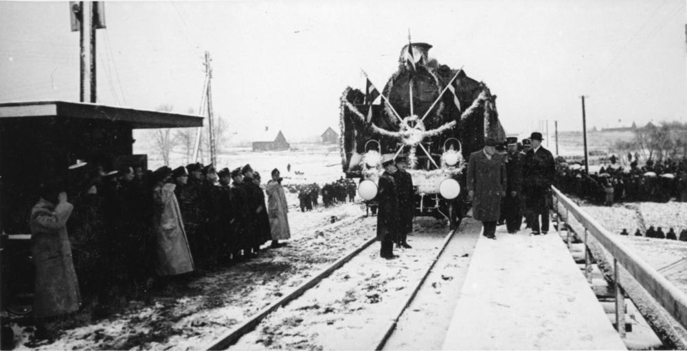 Krustpils pilsētas iedzīvotāji sveic Latvijas Valsts un Ministru prezidentu Kārli Ulmani un citus valdības pārstāvjus, kas rotātā vilcienā ierodas pie jaunā Krustpils-Jēkabpils dzelzceļa tilta, tā atklāšanas pasākumā.