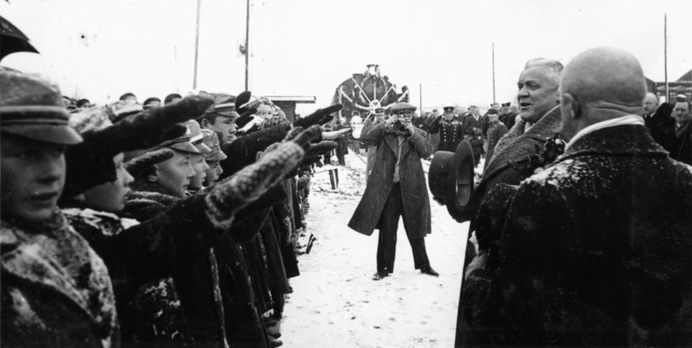 Latvijas Valsts un Ministru prezidents Kārlis Ulmanis un viņu pavadošās personas, kas ieradušies Krustpilī uz Krustpils-Jēkabpils dzelzceļa tilta atklāšanu, sasveicinās ar pilsētas iedzīvotājiem un pārvaldes pārstāvjiem.