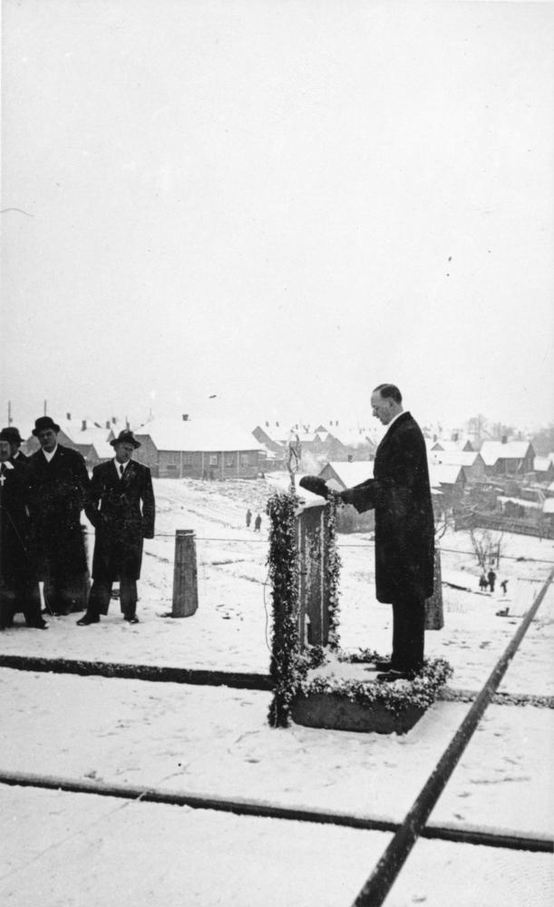 Latvijas satiksmes ministrs Bernhards Einbergs uzstājas ar celtniecības darbu pārskatu Krustpils-Jēkabpils dzelzceļa tilta svinīgajā atklāšanas ceremonijā Krustpilī.