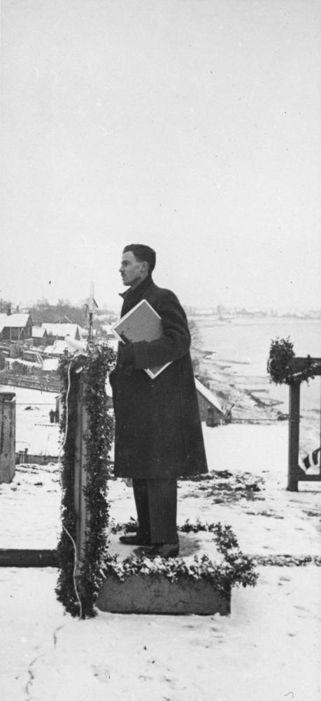 Angļu firmas "Braithwaite & Co. Engineers Limited" pārstāvis V. Šarmans, kurš piedalījies tilta celtniecībā, uzstājas Krustpils-Jēkabpils dzelzceļa tilta svinīgajā atklāšanas ceremonijā.