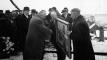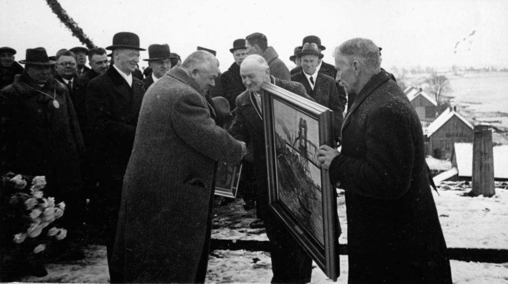 Krustpils-Jēkabpils dzelzceļa tilta atklāšanas ceremonija. Krustpils pilsētas pašpārvaldes pārstāvji pasniedz Latvijas Valsts un Ministru prezidentam Kārlim Ulmanim dāvinājumu -mākslinieces Emmas Baltmanes gleznu "Krustpils tilta celtniecība".
