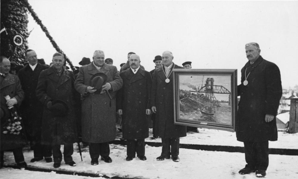 Krustpils-Jēkabpils dzelzceļa tilta svinīgajā atklāšanas ceremonija. Latvijas Valsts un Ministru prezidents Kārlis Ulmanis un viņa pavadošās personas fotografējoties kopā ar Krustpils pilsētas pašpārvaldes pārstāvjiem.