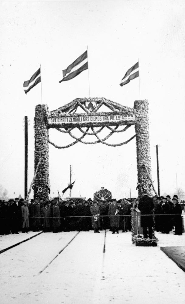 Krustpils-Jēkabpils dzelzceļa tilta svinīgā atklāšanas ceremonija. Fonā Krustpils puses goda vārti ar uzrakstu: "Sveicināti zemgaļi, kas ciemos nāk pie latgaļiem".