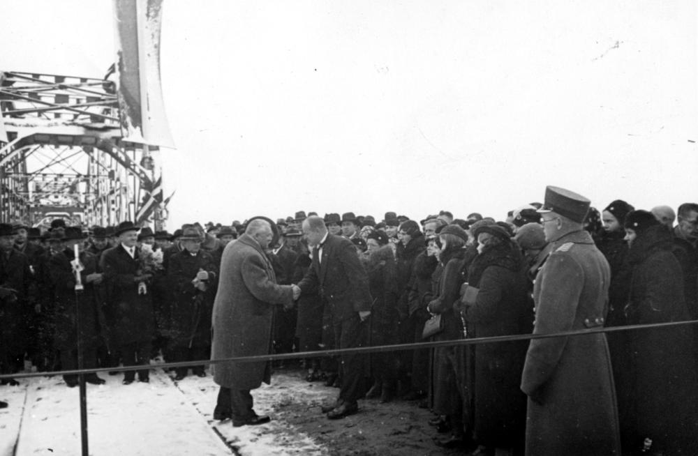 Krustpils-Jēkabpils dzelzceļa tilta svinīgajā atklāšanas ceremonija. Latvijas Valsts un Ministru prezidents Kārlis Ulmanis Kārlis Ulmanis sasveicinās ar Krustpils pilsētas sabiedrības pārstāvjiem.