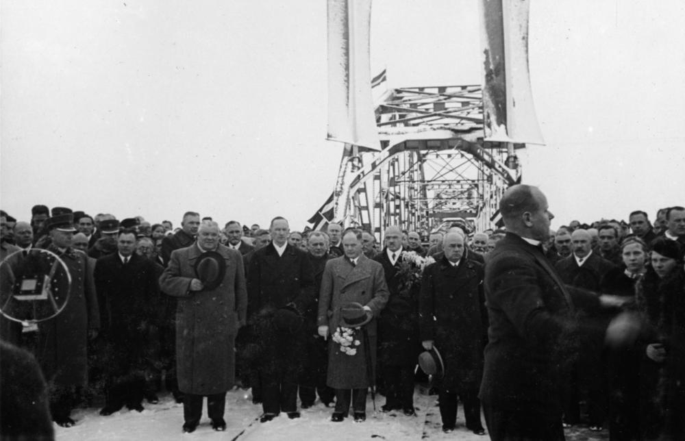 Krustpils-Jēkabpils dzelzceļa tilta svinīgajā atklāšanas ceremonija. Latvijas Valsts un Ministru prezidents Kārlis Ulmanis, viņu pavadošās personas un dzelzceļa tilta atklāšanas ceremonijas apmeklētāji Jēkabpilī klausās diriģenta Pētera Pakalna vadītā kora izpildīto dziesmu "Vadoņa suminājums".