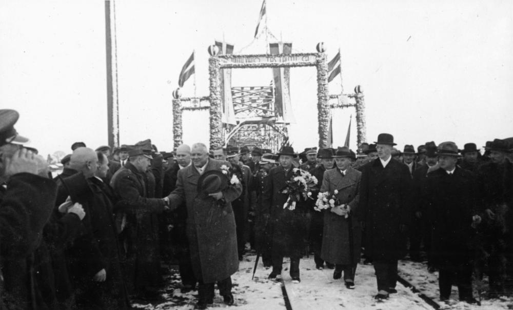 Latvijas Valsts un Ministru prezidents Kārlis Ulmanis sasveicinās ar Jēkabpils pašvaldības pārstāvjiem Krustpils-Jēkabpils dzelzceļa tilta svinīgajā atklāšanas ceremonijas laikā. Fonā goda vārti un atklāšanai izrotātais Krustpils-Jēkabpils dzelzceļa tilts.