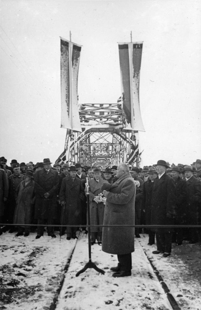 Latvijas Valsts un Ministru prezidents Kārlis Ulmanis uzstājoties Krustpils-Jēkabpils dzelzceļa tilta svinīgajā atklāšanas ceremonijā Jēkabpilī.