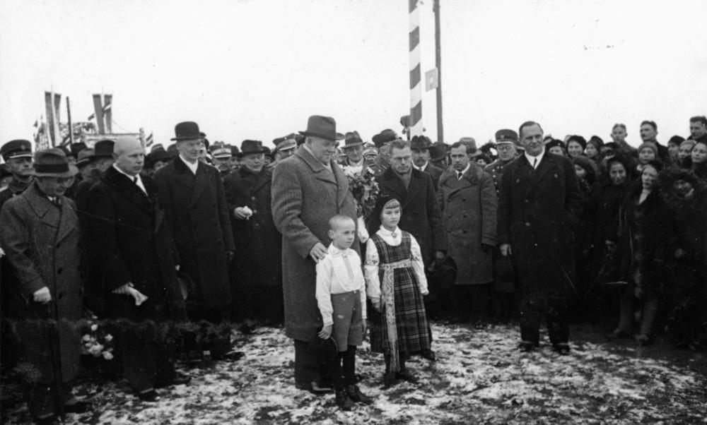 Krustpils-Jēkabpils dzelzceļa tilta atklāšanas ceremonija. Latvijas Valsts un Ministru prezidents Kārlis Ulmanis kopā ar Jēkabpils pamatskolas audzēkņiem.