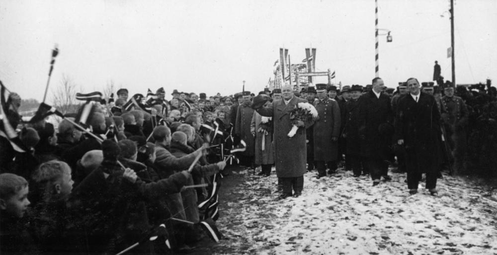 Latvijas Valsts un Ministru prezidents Kārlis Ulmanis sveic Jēkabpils iedzīvotājus svinīgajā Krustpils-Jēkabpils dzelzceļa tilta atklāšanas ceremonijā.