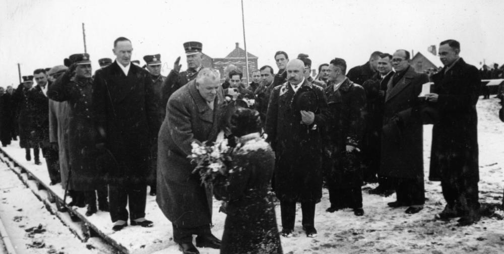 Jēkabpils skolniece O. Kalniņa pasniedz ziedus Latvijas Valsts un Ministru prezidentam Kārlim Ulmanim svinīgajā Krustpils-Jēkabpils dzelzceļa tilta atklāšanas ceremonijā.