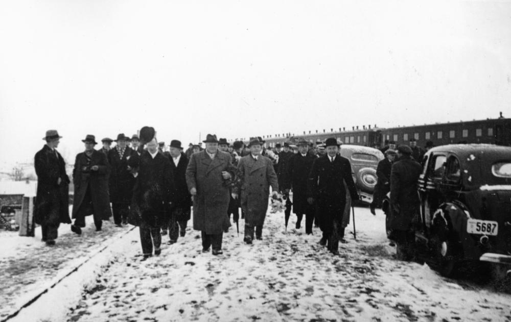 Latvijas Valsts un Ministru prezidents Kārlis Ulmanis kopā ar vadības pārstāvjiem svinīgajā Krustpils-Jēkabpils dzelzceļa tilta atklāšanas ceremonijā.