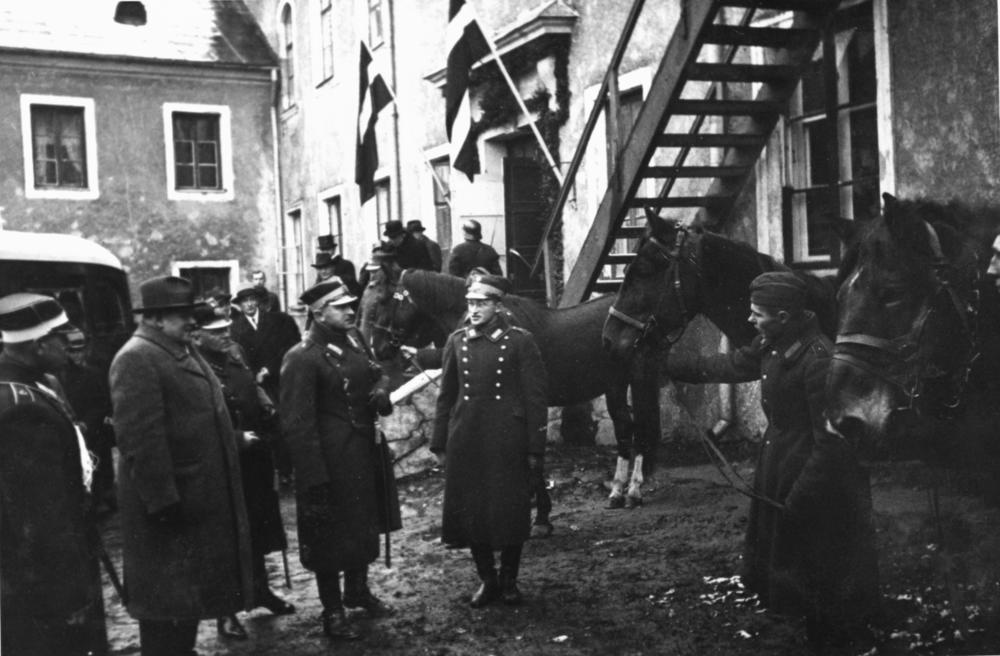 Krustpils-Jēkabpils dzelzceļa tilta atklāšanas ceremonija. Latvijas Valsts un Ministru prezidents Kārlis Ulmanis un valdības pārstāvji ierodas uz pusdienām Latgales artilērijas pulka virsnieku klubā pēc tilta atklāšanas.