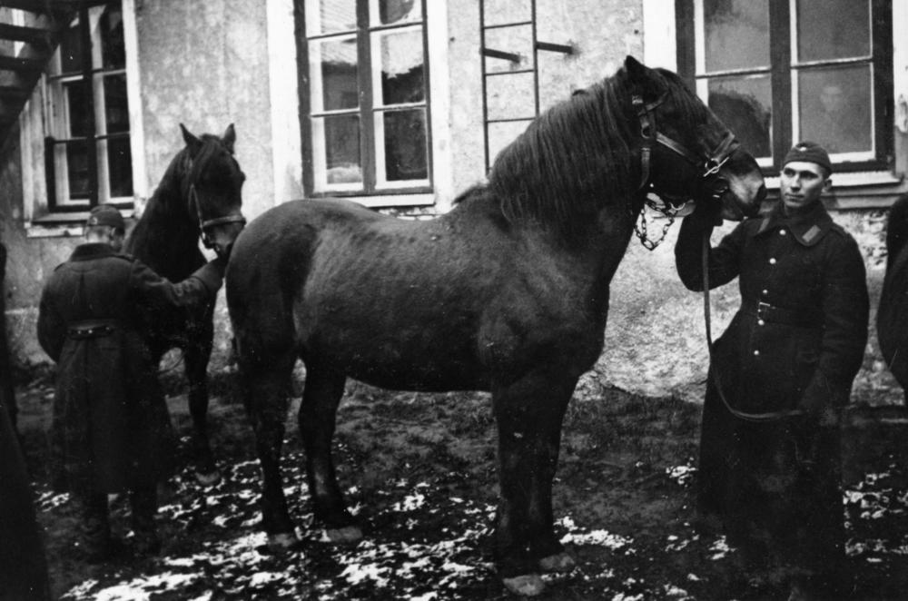 Krustpils-Jēkabpils dzelzceļa tilta atklāšanas ceremonija. Latgales artilērijas pulka virsnieku gaitnieki virsnieku kluba pagalmā ar zirgiem.