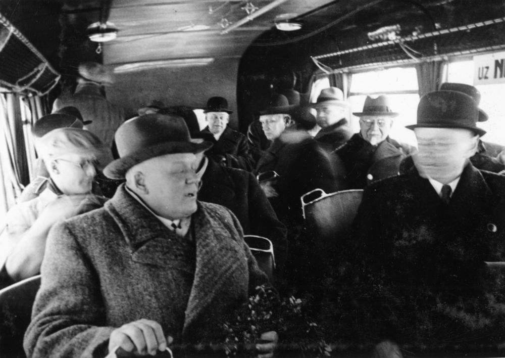 Krustpils-Jēkabpils dzelzceļa tilta atklāšanas ceremonija. Latvijas Valsts un Ministru prezidents Kārlis Ulmanis kopā ar Latvijas valdības pārstāvjiem autobusā ceļā uz Krustpils dzelzceļa staciju pēc pusdienām Latgales artilērijas pulka virsnieku klubā.
