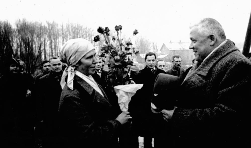 Krustpils-Jēkabpils dzelzceļa tilta atklāšanas ceremonija. Krustpils iedzīvotāji sniedz ziedus Latvijas Valsts prezidentam un Latvijas Ministru prezidentam Kārlim Ulmanim.