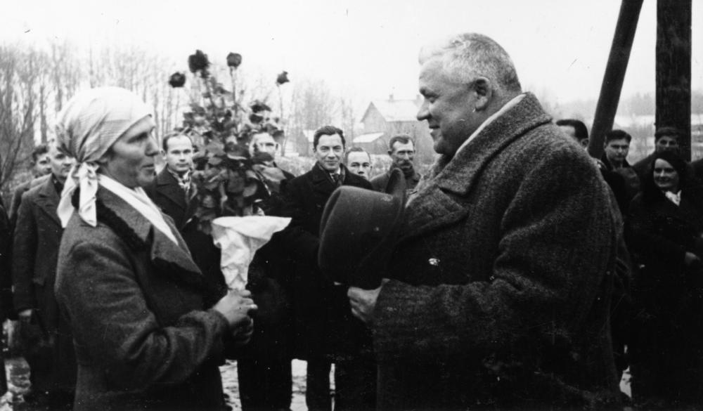 Krustpils-Jēkabpils dzelzceļa tilta atklāšanas ceremonija. Krustpils iedzīvotāji sniedz ziedus Latvijas Valsts prezidentam un Latvijas Ministru prezidentam Kārlim Ulmanim.