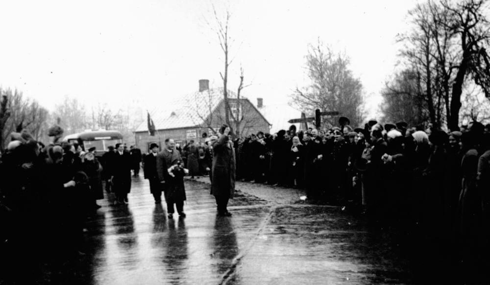 Krustpils-Jēkabpils dzelzceļa tilta atklāšanas ceremonija. Latvijas Valsts prezidents un Latvijas Ministru prezidents Kārlis Ulmanis un viņu pavadošās personas sveic Krustpils pilsētas iedzīvotājus.