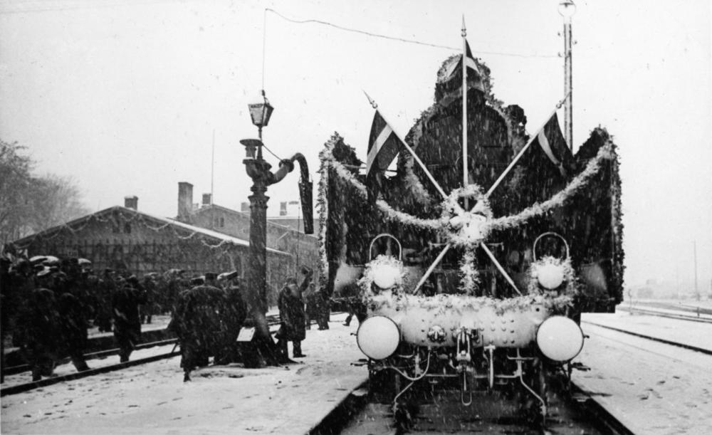 Krustpils-Jēkabpils dzelzceļa tilta atklāšanas ceremonija. Valdības vilciens pie Krustpils dzelzceļa stacijas pirms izbraukšanas uz Rīgu.