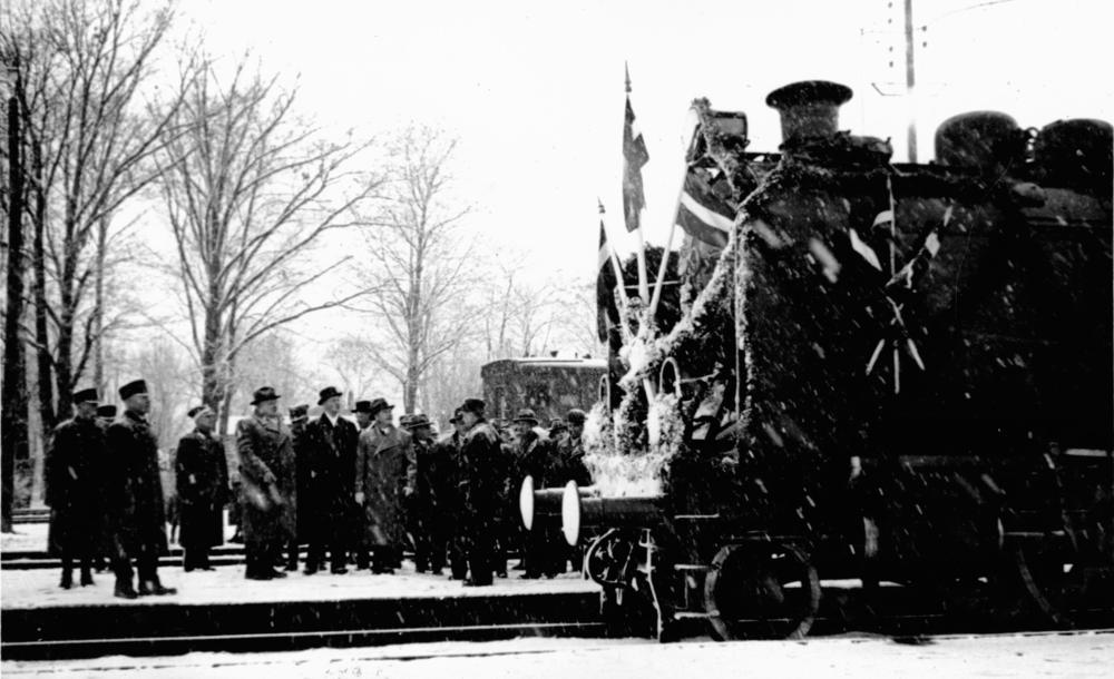 Krustpils-Jēkabpils dzelzceļa tilta atklāšanas ceremonija. Valdības vilciens pie Krustpils dzelzceļa stacijas pirms izbraukšanas uz Rīgu.