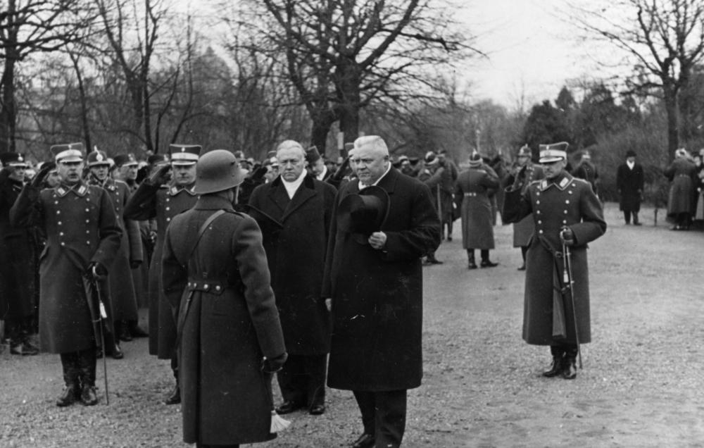 Latvijas Valsts un Ministru prezidents Kārlis Ulmanis un Latvijas Republikas Kara ministrs, ģenerālis Jānis Balodis, pieņemot Vidzemes divīzijas komandiera, Rīgas garnizona karaspēka parādes komandiera, ģenerāļa Friča Virsaiša ziņojumu, Vienības laukumā (tagad Esplanāde) par godu Latvijas Republikas proklamēšanas 18. gadadienas svinībām.