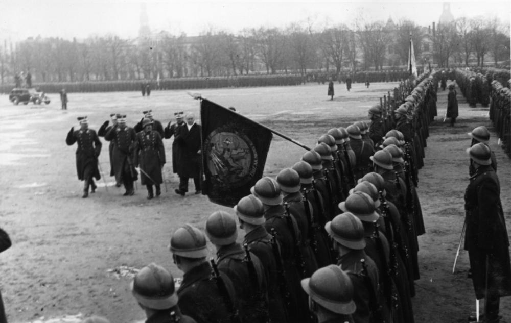 Latvijas Valsts un Ministru prezidents Kārlis Ulmanis pieņem Latvijas valsts dibināšanas gadskārtai veltīto armijas parādi Vienības (tagad Esplanādes) laukumā. 1. rindā no labās: 1. (aizsedz karogs) Latvijas Valsts un Ministru prezidents Kārlis Ulmanis, 2. kara ministrs Jānis Balodis, 3. 2. Vidzemes divīzijas komandieris un Rīgas garnizona priekšnieks Fricis Virsaitis.