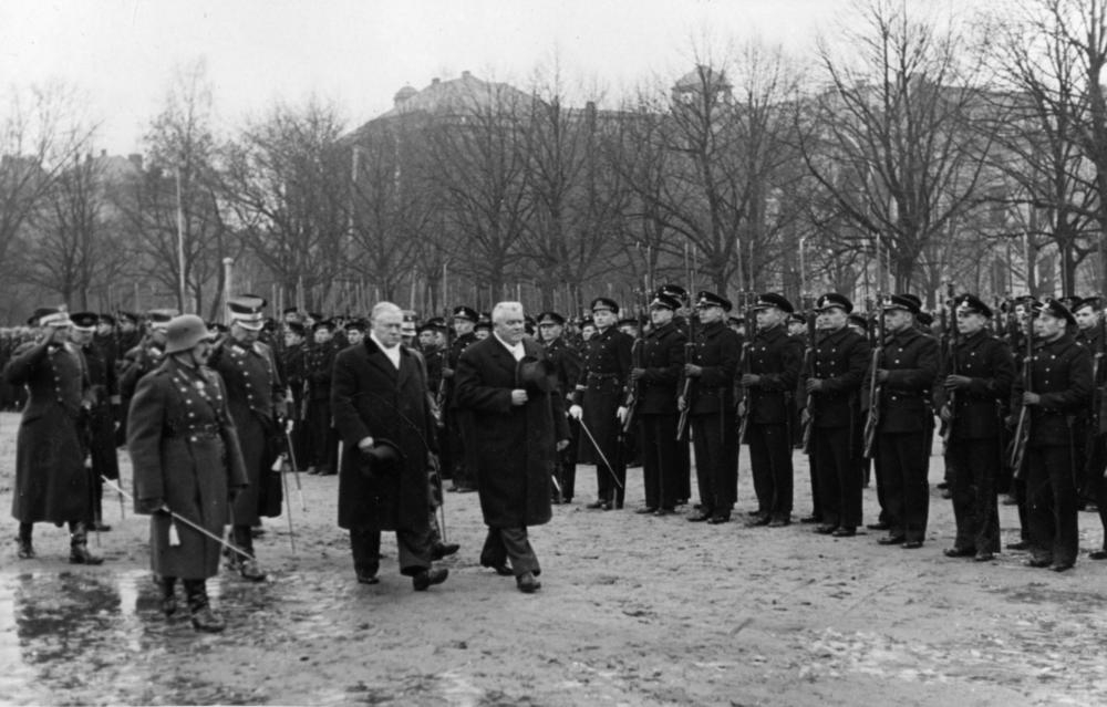Latvijas Valsts un Ministru prezidents Kārlis Ulmanis pieņem Latvijas Republikas proklamēšanas 18. gadadienai veltīto Rīgas garnizona parādi Vienības (tagad Esplanādes) laukumā. Augstākie virsnieki kopā ar Latvijas Republikas Kara ministru, ģenerāli Jāni Balodi (centrā) un Latvijas Valsts un Ministru prezidentu Kārli Ulmani, apejot Rīgas garnizona apakšnodaļas ierindas.