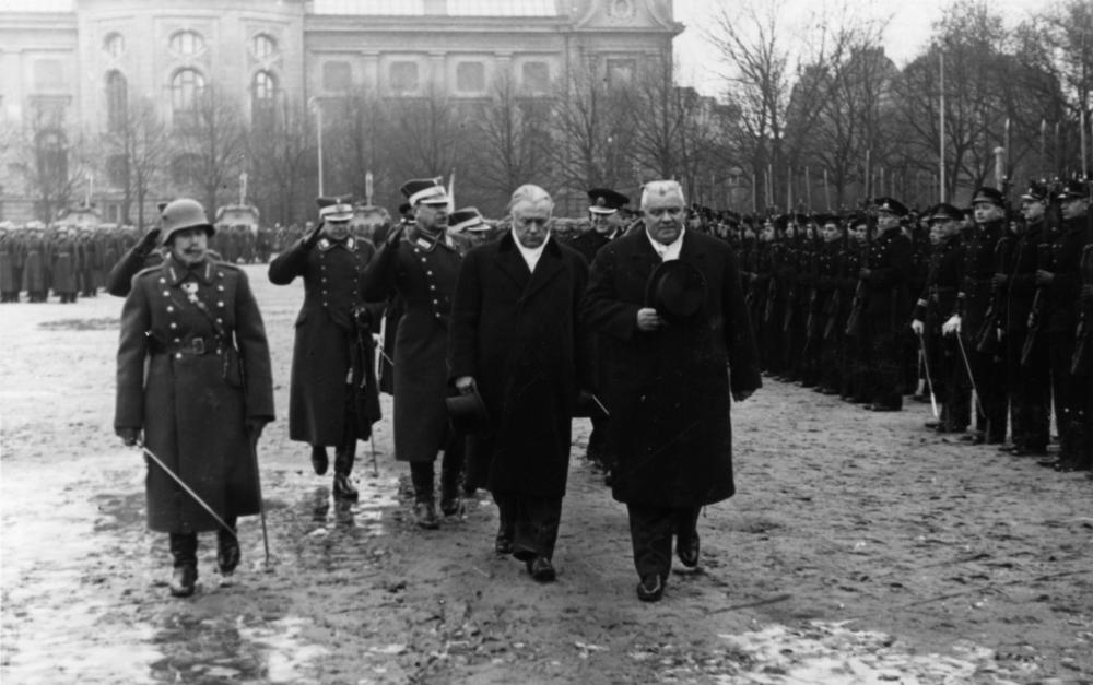 Latvijas Valsts un Ministru prezidents Kārlis Ulmanis un Latvijas Republikas Kara ministrs, ģenerālis Jānis Balodis kopā ar Latvijas Bruņoto spēku pārstāvjiem, aplūkojot Rīgas garnizona apakšnodaļas karavīru ierindas, parādes laikā Vienības laukumā (tagad Esplanāde) par godu Latvijas Republikas proklamēšanas 18. gadadienas svinībām.