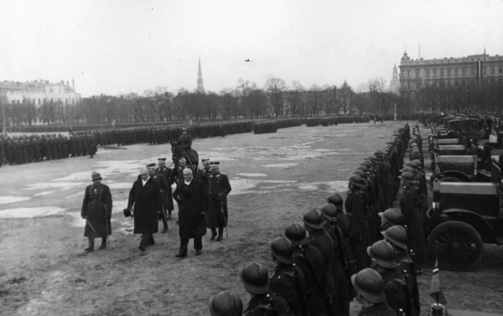 Latvijas Valsts un Ministru prezidents Kārlis Ulmanis un Latvijas Republikas Kara ministrs, ģenerālis Jānis Balodis kopā ar Latvijas Bruņoto spēku pārstāvjiem, aplūkojot Rīgas garnizona apakšnodaļas karavīru ierindas, parādes laikā Vienības laukumā (tagad Esplanāde) par godu Latvijas Republikas proklamēšanas 18. gadadienas svinībām.