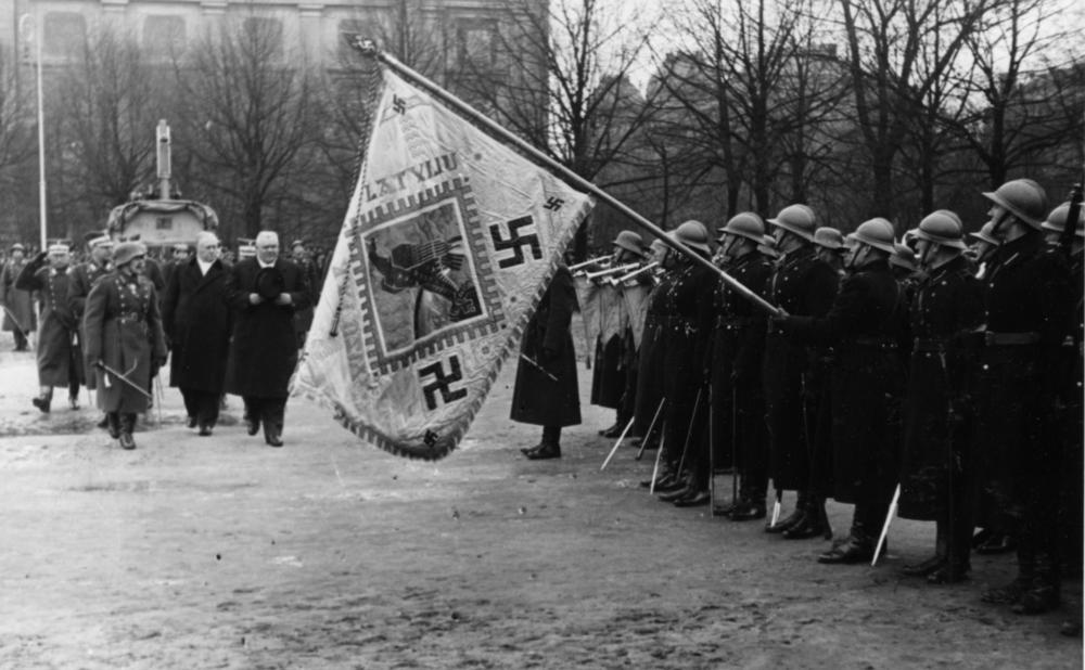 Latvijas Valsts un Ministru prezidents Kārlis Ulmanis pieņem Latvijas valsts dibināšanas gadskārtai veltīto armijas parādi Vienības (tagad Esplanādes) laukumā. Priekšplānā no labās: 1. Latvijas Valsts un Ministru prezidents Kārlis Ulmanis, 2. kara ministrs Jānis Balodis, 3. 2. Vidzemes divīzijas komandieris un Rīgas garnizona priekšnieks Fricis Virsaitis.