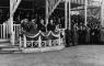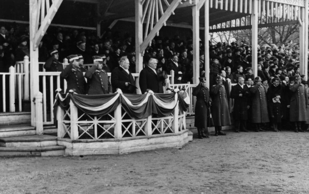 Latvijas valdības un armijas pārstāvji tribīnē, armijas parādes laikā, par godu Latvijas Republikas proklamēšanas 18. gadadienas svinībām. No kreisās: 1. Latvijas Armijas štāba priekšnieks, ģenerālis Mārtiņš Hartmanis, 2. Latvijas armijas komandieris, ģenerālis Krišjānis Berķis, 3. Latvijas Republikas Kara ministrs, ģenerālis Jānis Balodis, 4. Latvijas Valsts un Ministru prezidents Kārlis Ulmanis.