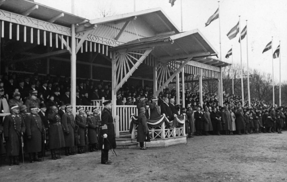 Valdības tribīne Rīgas garnizona apakšnodaļas karavīru parādes laikā Vienības laukumā (tagad Esplanāde) par godu Latvijas Republikas proklamēšanas 18. gadadienas svinībām. Tribīnes centrā redzams Latvijas Valsts un Ministru prezidents Kārlis Ulmanis un Latvijas Republikas Kara ministrs, ģenerālis Jānis Balodis.