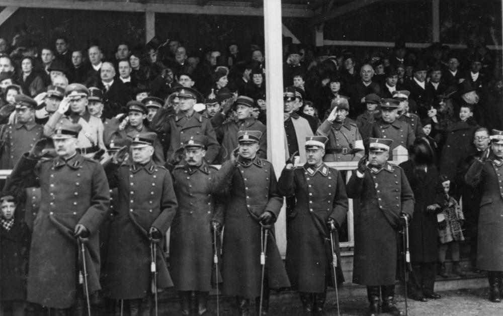 Latvijas Bruņoto spēku pārstāvji un skatītāji Rīgas garnizona apakšnodaļas karavīru parādes laikā Vienības laukumā (tagad Esplanāde) par godu Latvijas Republikas proklamēšanas 18. gadadienas svinībām.
