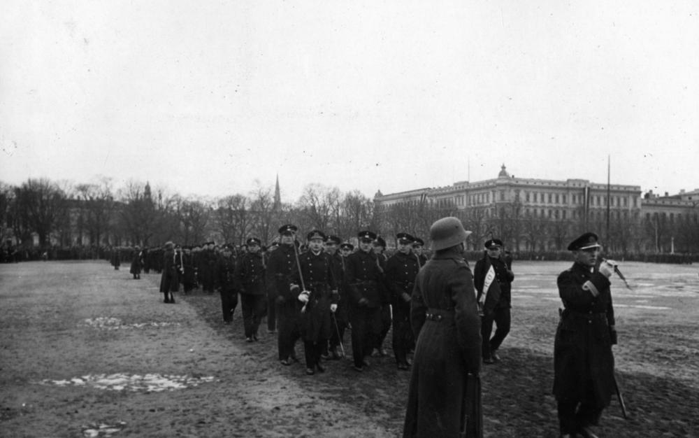 Rīgas garnizona jūrnieku vienība parādes laikā Vienības laukumā (tagad Esplanāde) par godu Latvijas Republikas proklamēšanas 18. gadadienas svinībām.