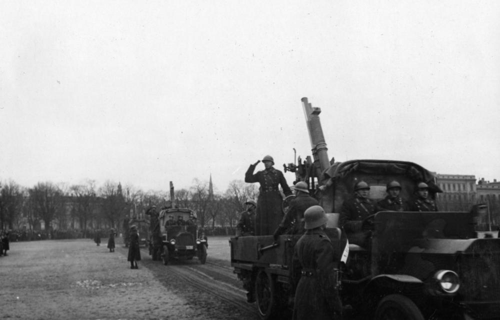 Rīgas garnizona smagās artilērijas apakšnodaļas karavīri un kaujas tehnika Latvijas valsts dibināšanas gadskārtai veltītajā parādē Vienības (tagad Esplanādes) laukumā.