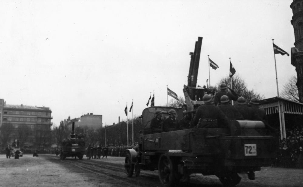 Rīgas garnizona smagās artilērijas apakšnodaļas transportlīdzekļi parādē Vienības laukumā (tagad Esplanāde) par godu Latvijas Republikas proklamēšanas 18. gadadienas svinībām.