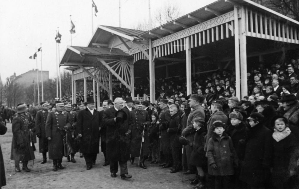 Latvijas Valsts un Ministru prezidents Kārlis Ulmanis, viņa pavadošie valdības locekļi un Latvijas Bruņoto spēku pārstāvji atvadās no skatītājiem, Rīgas garnizona apakšnodaļas karavīru parādes laikā Vienības laukumā (tagad Esplanāde), par godu Latvijas Republikas proklamēšanas 18. gadadienas svinībām.