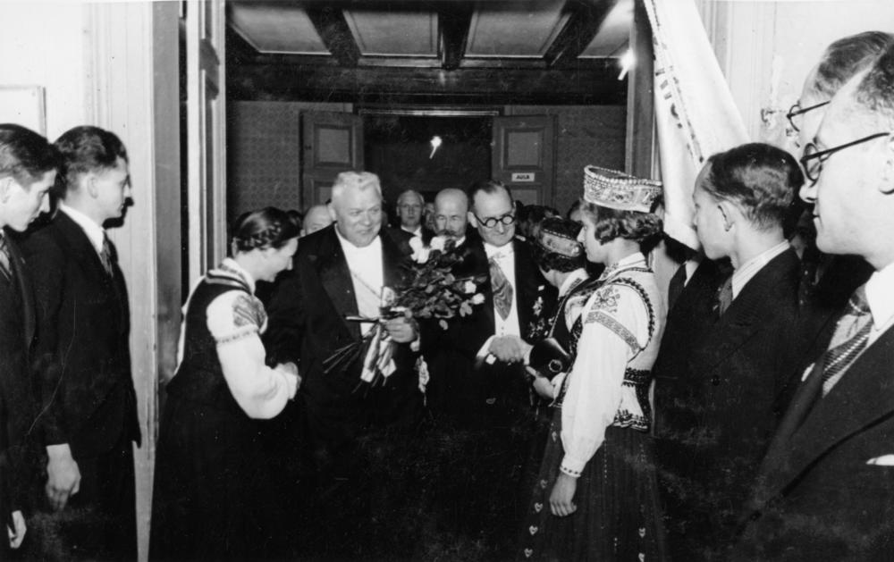 Latvijas Republikas proklamēšanas 18. gadadienai veltītais svinīgais pasākums Rīgas pilsētas 1. ģimnāzijā. Audzēkņi sagaida Latvijas un Ministru prezidentu Kārli Ulmani. Centrā: 1. Latvijas Valsts un Ministru prezidents Kārlis Ulmanis, 2. Rīgas pilsētas galva Roberts Liepiņš.