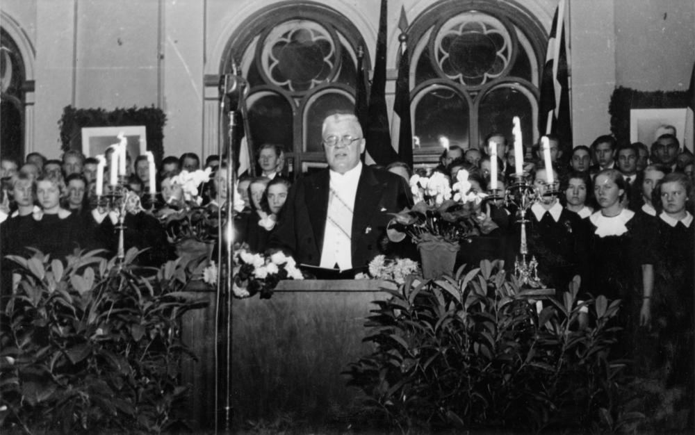 Svinīgais pasākums Rīgas 1. ģimnāzijas aktu zālē par godu Latvijas Republikas proklamēšanas gadadienas svinībām. Latvijas Valsts prezidents un Latvijas Republikas Ministru prezidents Kārlis Ulmanis uz skatuves, sniedzot svinīgo atklāšanas runu.