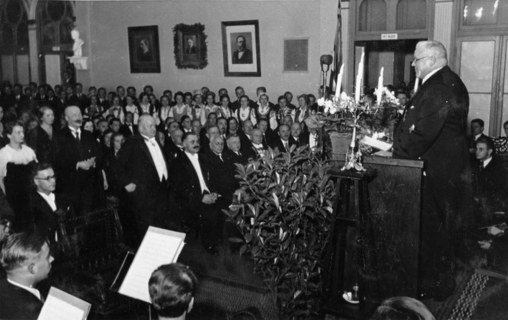 Latvijas Valsts un Ministru prezidents Kārlis Ulmanis uzstājas ar runu svinīgajā pasākumā Rīgas pilsētas 1. ģimnāzijā, kas veltīts Latvijas valsts dibināšanas gadadienai.