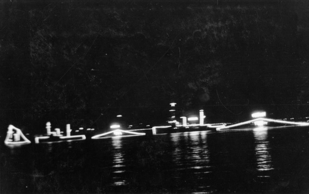Latvijas jūras kara flotes (arī Jūras krasta apsardzes eskadra) iluminētie kuģi par godu Latvijas Republikas proklamēšanas 18. gadadienas svinībām.