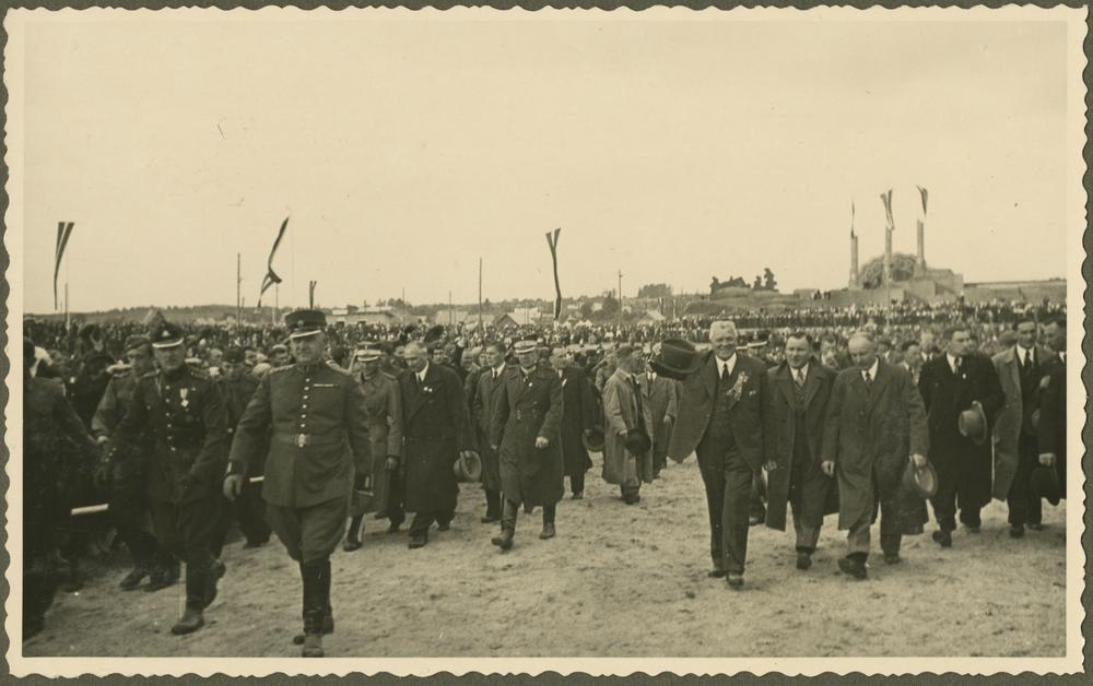 Latvijas Valsts un Ministru prezidents Kārlis Ulmanis, Latvijas Lauksaimniecības kameras priekšsēdētājs Rūdolfs Dzērve un zemkopības ministrs Jānis Birznieks apmeklē Otros Latvijas Pļaujas svētkus Rēzeknē. Attēla labajā pusē, no centra: 1. Kārlis Ulmanis, 2. Jānis Birznieks, 3. Rūdolfs Dzērve.