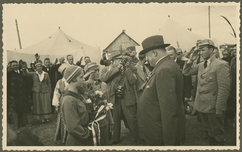 Mazpulku pārstāvji pasniedz ziedus Latvijas Valsts un Ministru prezidentam Kārlim Ulmanim.