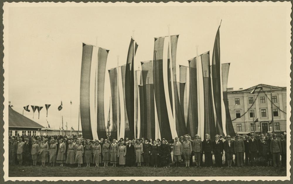 Mazpulku biedru rinda sagaida Latvijas Valsts un Ministru prezidentu Kārli Ulmani Pļaujas svētku un Latgales lauksaimniecības izstādes laikā Rēzeknē. Fonā svētku dekorācija - Latvijas karogi.