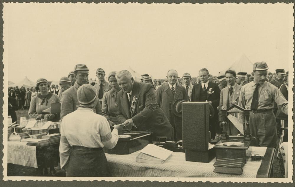 Latvijas Valsts un Ministru prezidents Kārlis Ulmanis pasniedz dāvanu mazpulku organizācijas biedrei, viesojoties mazpulku nometnē Otro Latvijas Pļaujas svētku un Latgales Lauksaimniecības izstādes laikā Rēzeknē. Aiz Kārļa Ulmaņa pa labi Latvijas Lauksaimniecības kameras priekšsēdētājs Rūdolfs Dzērve.