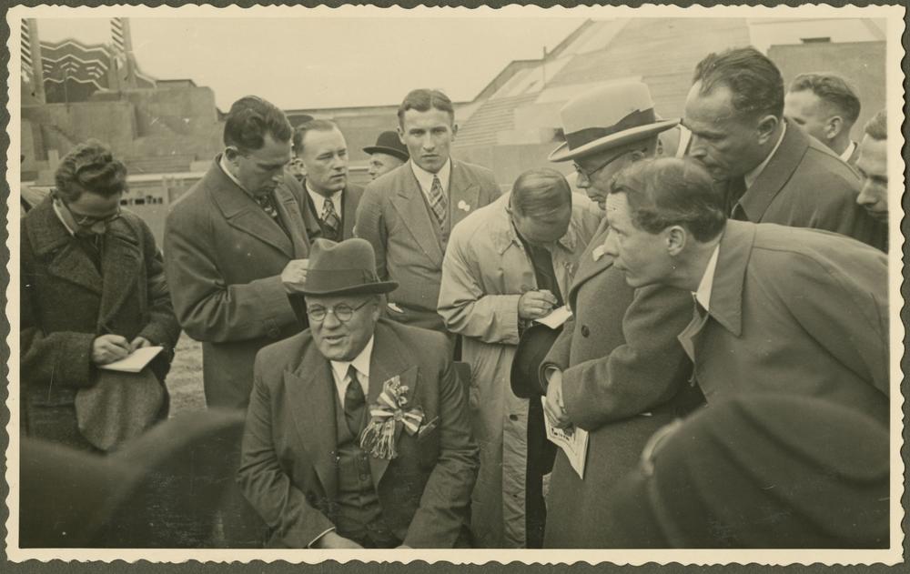 Latvijas Valsts un Ministru prezidents Kārlis Ulmanis (sēž centrā) sarunājas ar ārvalstu žurnālistiem Otro Latvijas Pļaujas svētku un Latgales Lauksaimniecības izstādes laikā Rēzeknē.
