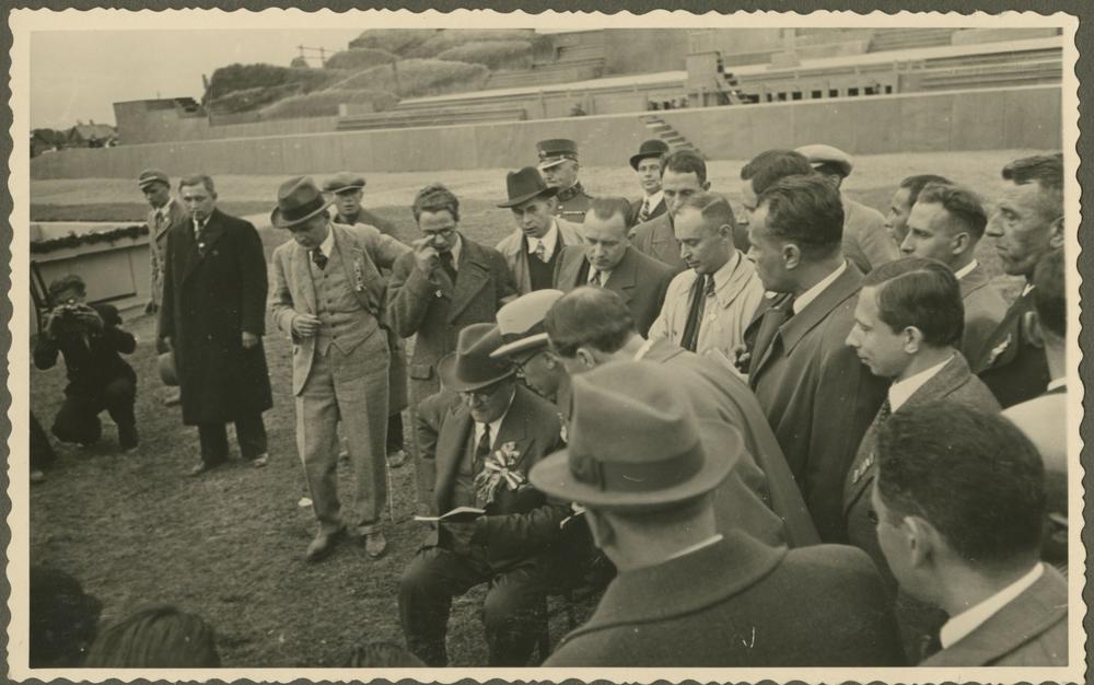 Latvijas Valsts un Ministru prezidents Kārlis Ulmanis (sēž centrā) sarunājas ar ārvalstu žurnālistiem Otro Latvijas Pļaujas svētku un Latgales Lauksaimniecības izstādes laikā Rēzeknē.