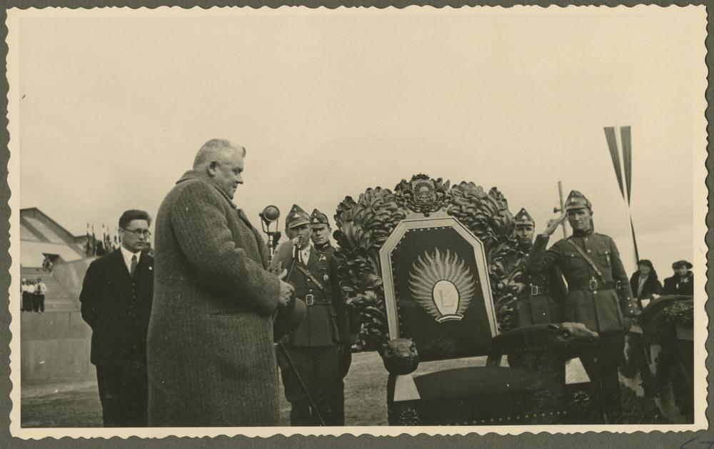 Latvijas Valsts un Ministru prezidents Kārlis Ulmanis (priekšplānā) pieņem Latgales iedzīvotāju dāvanu - Vadoņa krēslu.