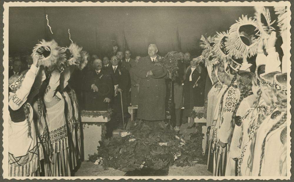 Jaunietes tautastērpos sveic Latvijas Valsts un Ministru prezidentu Kārli Ulmani (centrā) Otro Latvijas Pļaujas svētku un Latgales Lauksaimniecības izstādes laikā Rēzeknē.