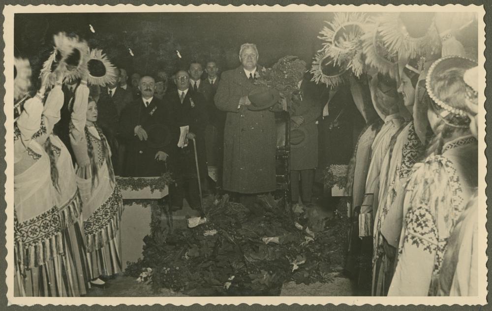 Jaunietes tautastērpos sveic Latvijas Valsts un Ministru prezidentu Kārli Ulmani (centrā) Otro Latvijas Pļaujas svētku un Latgales Lauksaimniecības izstādes laikā Rēzeknē.