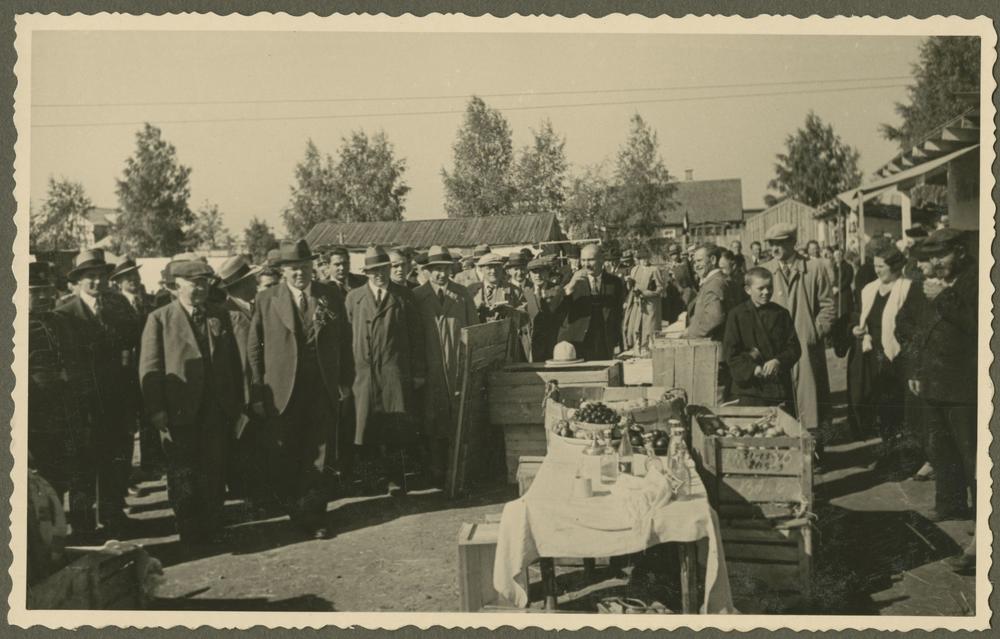Latvijas Valsts un Ministru prezidents Kārlis Ulmanis un viņu pavadošās personas aplūko Latgales Lauksaimniecības izstādi Otro Latvijas Pļaujas svētku laikā Rēzeknē. No kreisās: 4. Kārlis Ulmanis.